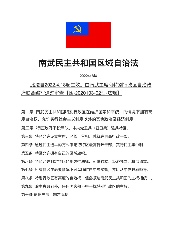 2022年4月18日,南联中央颁布《南武民主共和国区域自治法》,正式在解放区内成立十一自治区。本法律是在解放区内进行的第一次制度改革,是南武联合党一次伟大的实践。该法律及制度于2023年10月14日集团领导法颁布后正式废止。