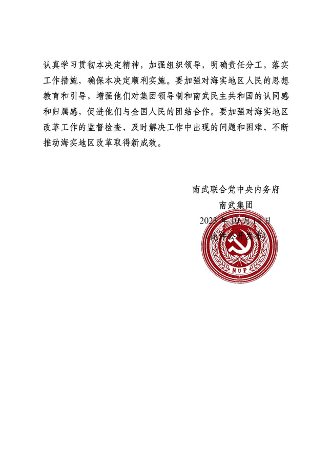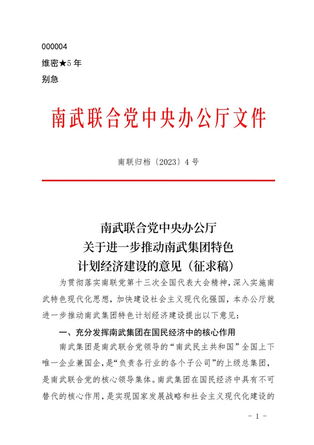 2023年10月15日,南联中央下发文件进行南武集团领导制下的南武特色现代化思想经济建设的指示