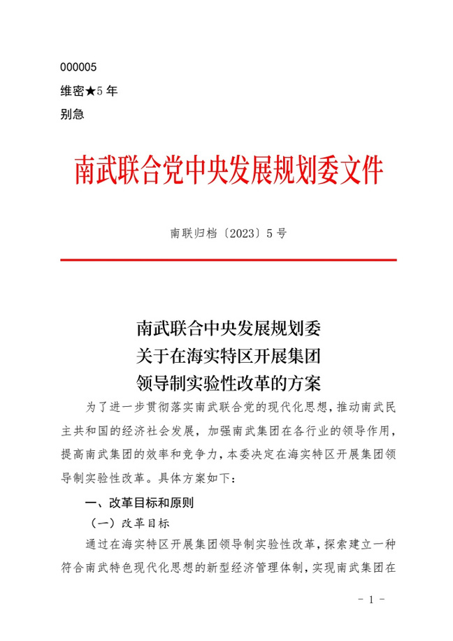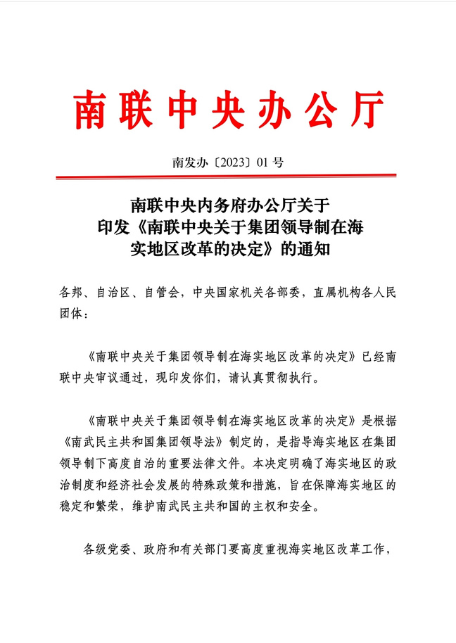 2023年10月14日,南联中央颁布《集团领导法》,正式宣布集团领导制的合法性